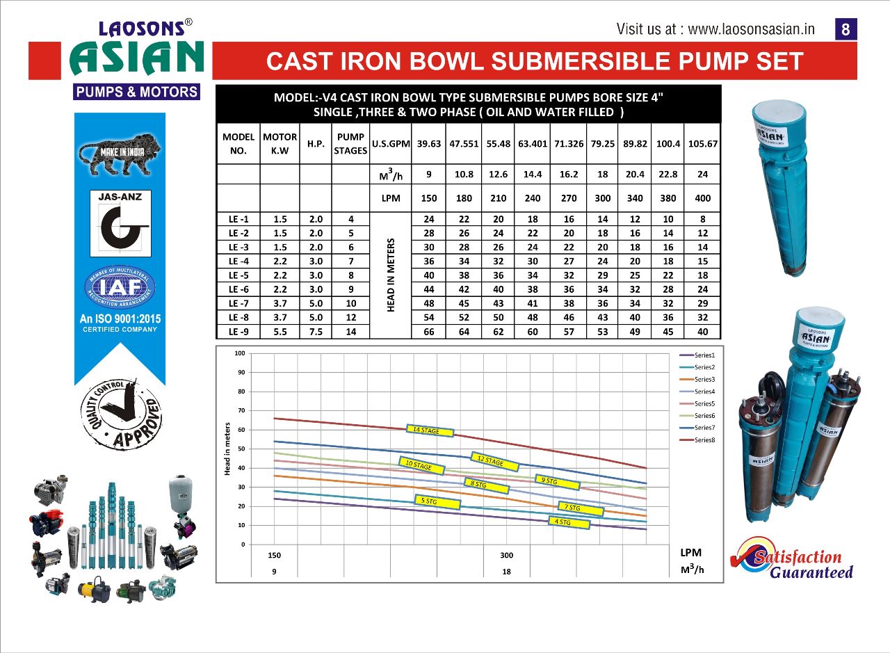 Laosonsasian V4 Cast Iron Bowl Submercible Pump & motors are well known for its quality, Reliability & excellence for all type of service purpose. OSWAL submersible pumps & motors are manufactured under supervision of highly qualified technical team with a stage wise rigid inspection procedure under TQM concepts. Application of Bore well submersible pumps are in Hospitals, Water circulation systems, Water supply systems of Government, Irrigation, Farms & Drip & sprinkler irrigation, Gardening, Nurseries, Domestic water supply, Multi-storey Building, Industries & Hotels.