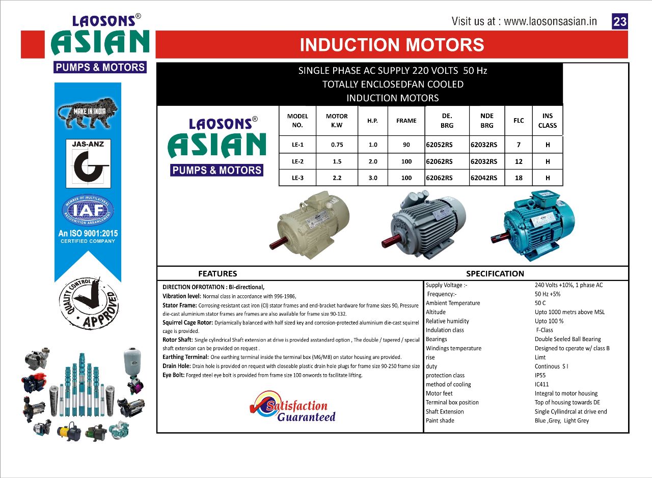 Laosonsasian Induction Motors for various industrial application like Machine tools, Textiles, Air Conditioning, Dairy Equipments, Crane & Hoist, Pollution control, Aquaculture & agriculture, Fertilizers, Mines & Chemicals Industry.