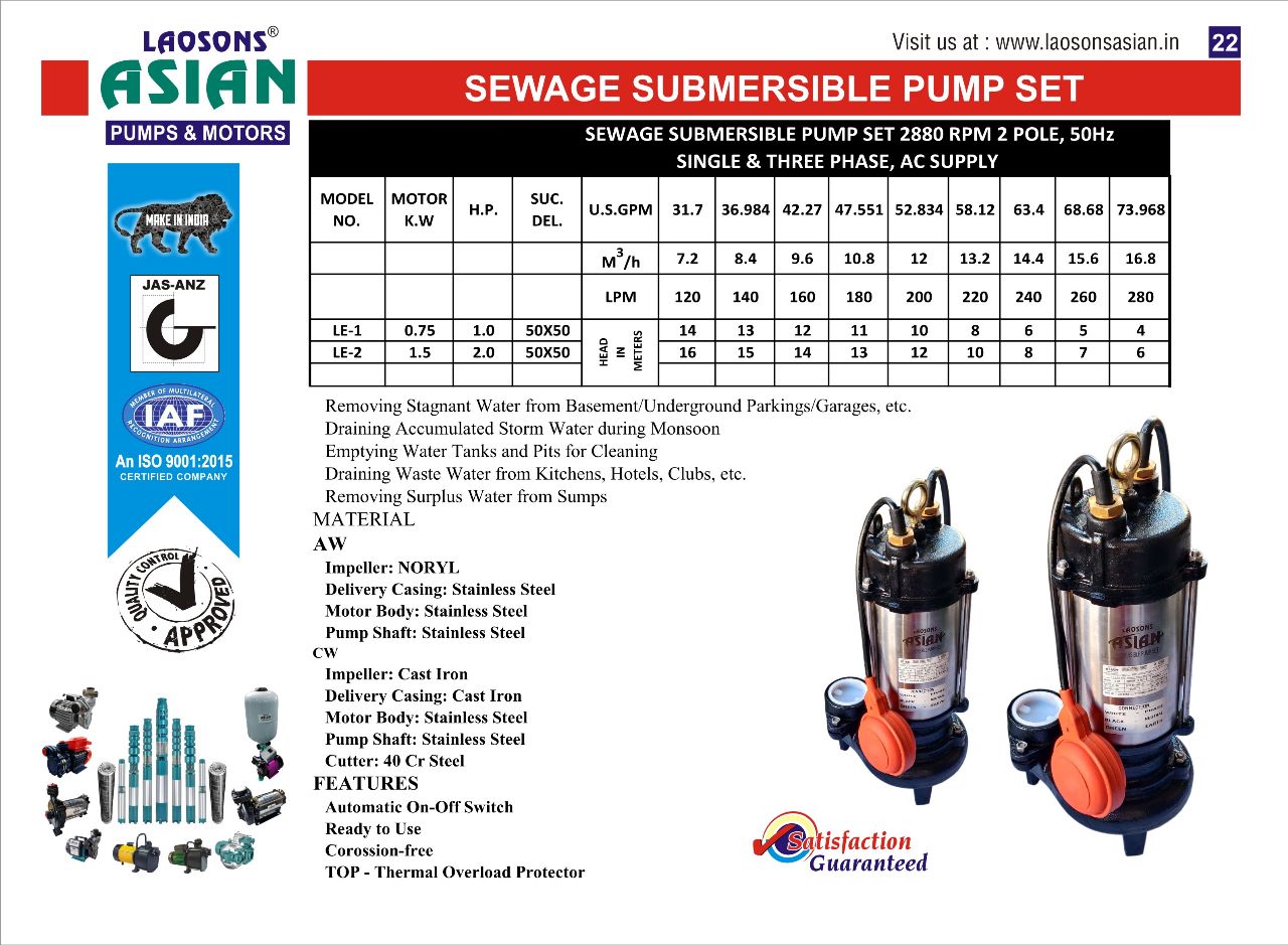 Laosonsasian Sewage Pumps SEWAGE PUMPS Drainage of sewage from the building basements, hotel industry, waste water from factories. Drainage of sewage from industrial process factories. Emptying of septic tanks, cesspits and sewage pump stations.Pumping surface and drainage water from garages and sprinkler systems.