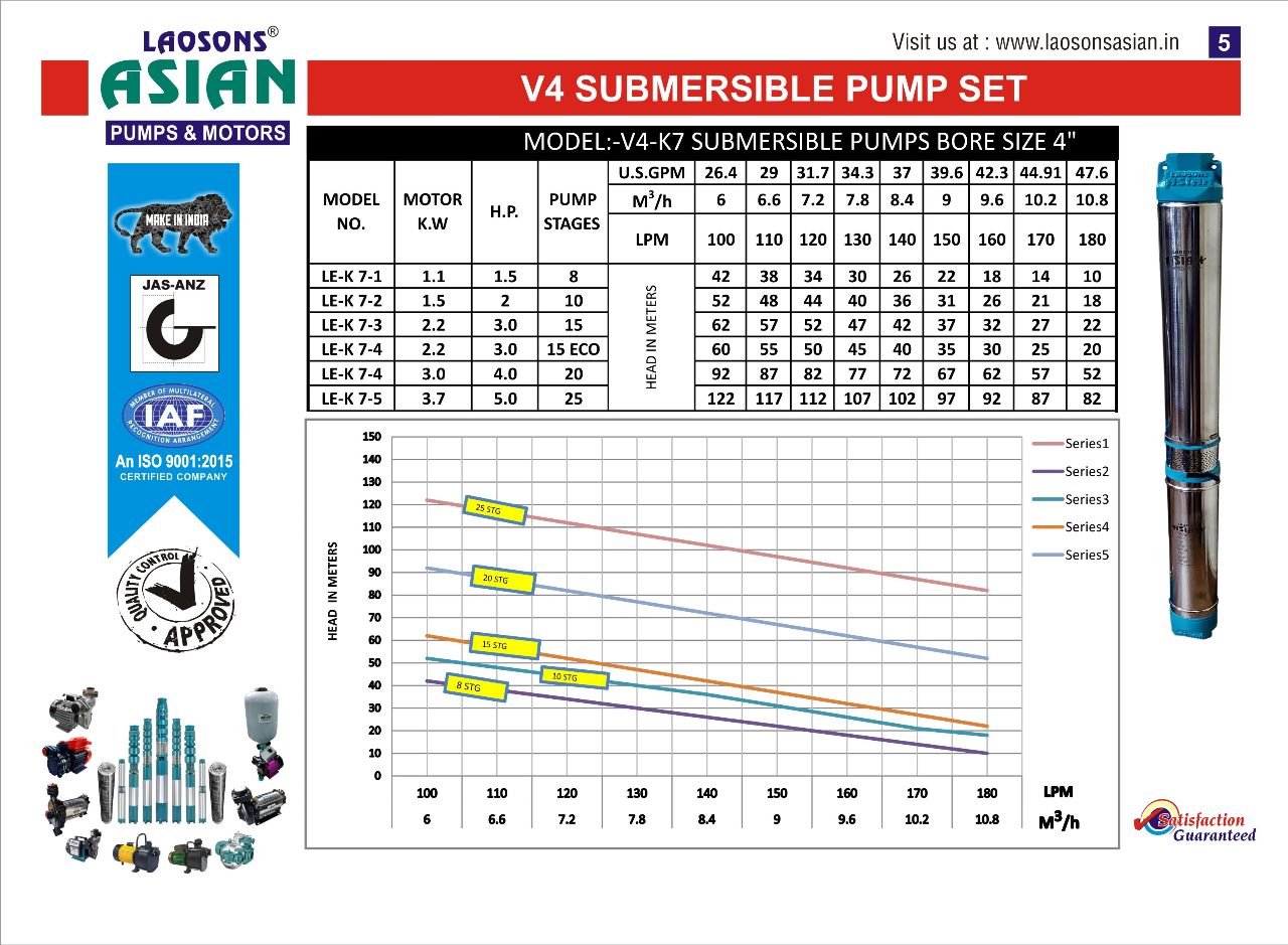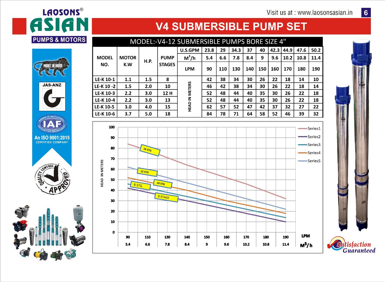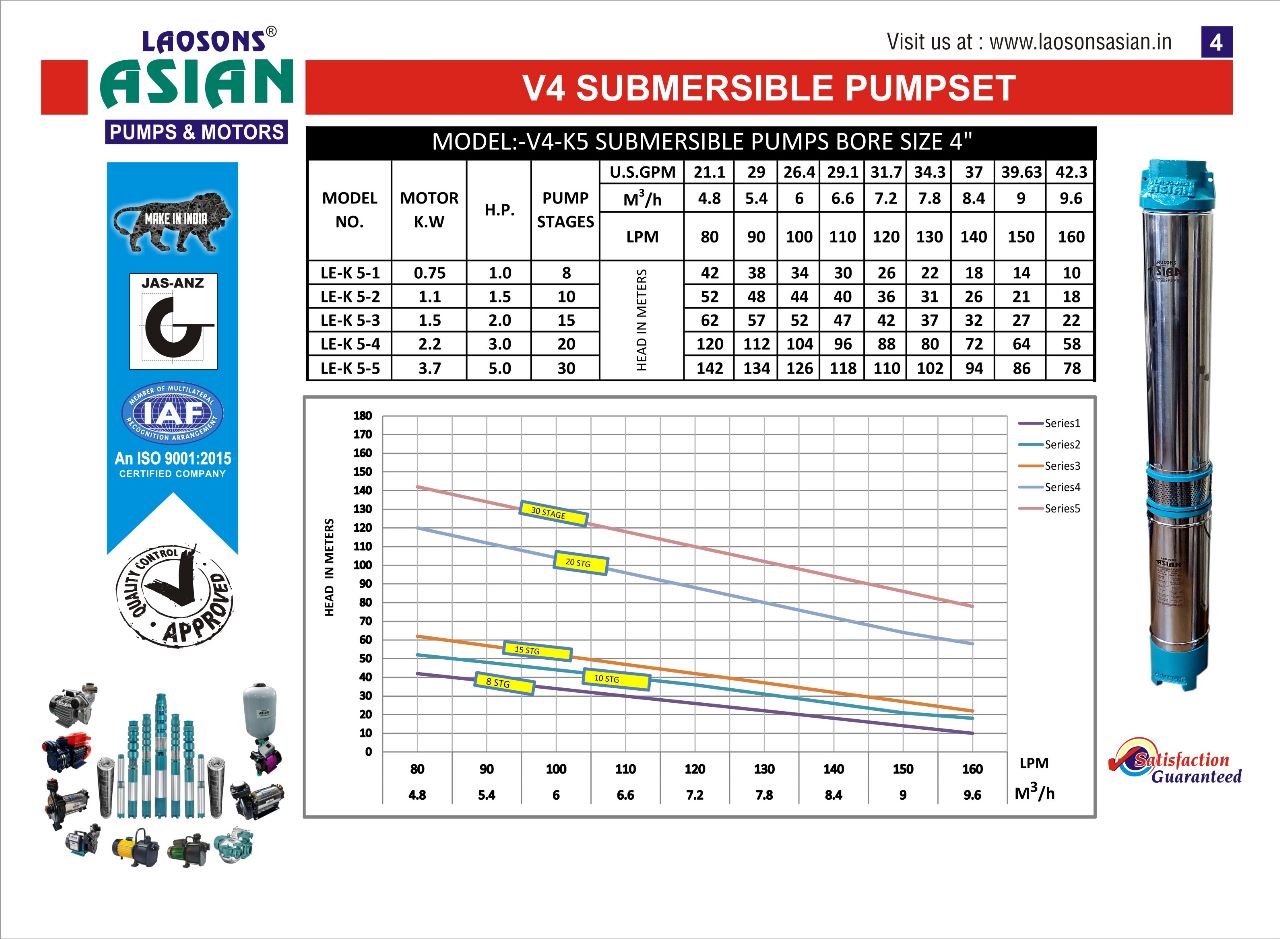 Laosonsasian V4 Oil Filled "Gold" and "Dicor" series - V4 BOREWELL SUBMERSIBLE PUMPSETS (OIL FILLED) 100MM laosonsasian submersible pumps & motors are well known for its quality, Reliability & excellence for all type of service purpose. laosonsasian submersible pumps & motors are manufactured under supervision of highly qualified technical team with a stage wise rigid inspection procedure under TQM concepts. Application of Bore well submersible pumps are in Hospitals, Water circulation systems, Water supply systems of Government, Irrigation, Farms & Drip & sprinkler irrigation, Gardening, Nurseries, Domestic water supply, Multi-storey Building, Industries & Hotels etc.